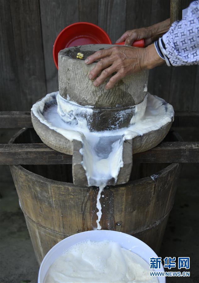 7月19日,在湖北恩施土家族苗族自治州宣恩县晓关侗族乡黄草坝村,村民在用石磨将黄豆磨成合渣浆。 新华社发(宋文 摄)