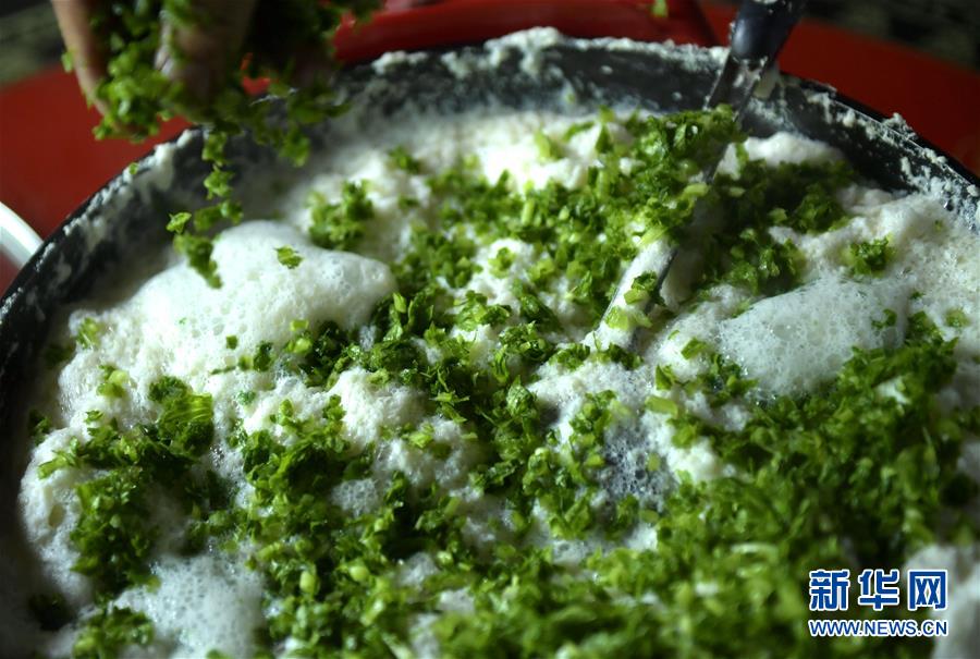 7月19日,在湖北恩施土家族苗族自治州宣恩县晓关侗族乡黄草坝村,村民将切粹的萝卜叶放入煮沸的黄豆浆里制作成合渣。 新华社发(宋文 摄)