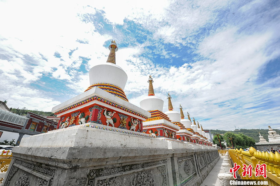 塔尔寺又名塔儿寺,创建于明洪武十年(1377年)。得名于大金瓦寺内为纪念黄教创始人宗喀巴而建的大银塔,藏语称为“衮本贤巴林”,意思是“十万狮子吼佛像的弥勒寺”。图为位于塔尔寺寺前广场的八宝如意塔。 中新网记者 富宇 摄