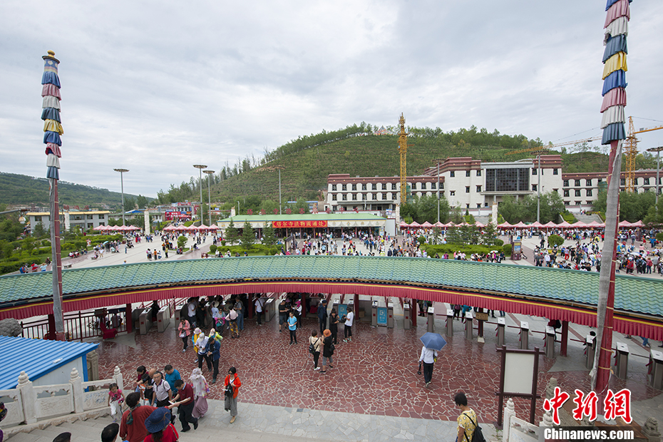 塔尔寺前的广场,游人络绎不绝。 中新网记者 富宇 摄