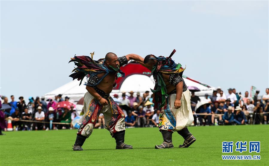 7月22日,在西乌珠穆沁旗的白马文化节上,当地牧民正在进行搏克比赛。 近日,内蒙古自治区西乌珠穆沁旗举办第五届白马文化节。在为期两天的文化节中,当地牧民参加骑马、射箭、搏克等蒙古族传统体育运动,展现了蒙古族民俗文化与草原儿女风采。 新华社记者 刘磊 摄