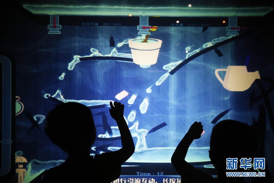 7月22日,小朋友在厦门科技馆内体验虚拟水流。 暑假期间,许多小朋友在家长的陪伴下来到厦门科技馆参观学习科学知识、体验科技魅力。 新华社发(曾德猛 摄)
