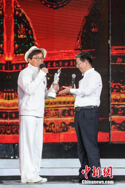 7月22日晚,第四届成龙国际动作电影颁奖晚会在山西大同古城南城墙城关内举行,大同市委书记张吉福赠送给成龙“龙凤杯”,邀请成龙成为大同市荣誉市民。 武俊杰 摄