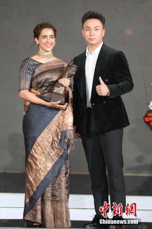 7月22日晚,第四届成龙国际动作电影颁奖晚会在山西大同古城南城墙城关内举行,印度演员桑亚·玛荷塔凭借《摔跤吧!爸爸》获最佳动作新人,释小龙为其颁奖。武俊杰 摄