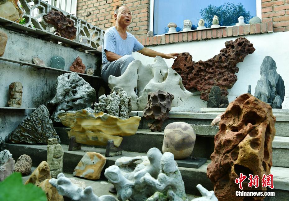 7月23日下午,在河北井陉县76岁老人关雨来的家中,老人介绍并展示他的各种奇石收藏品。近20年来,关雨来已藏石300余块。其中,“西游记”、“中国十二生肖”和“奇石宴”让人大开眼界。中新社记者 翟羽佳 摄