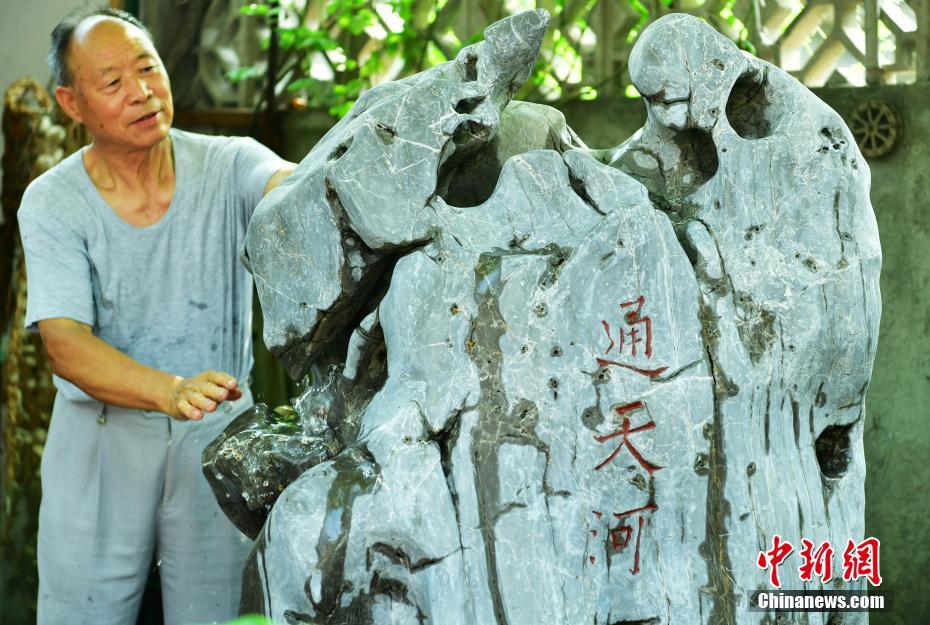 7月23日下午,在河北井陉县76岁老人关雨来的家中,老人介绍1吨多重、由巨龟和孙悟空组成的“西游记——通天河”奇石。近20年来,关雨来已藏石300余块。中新社记者 翟羽佳 摄