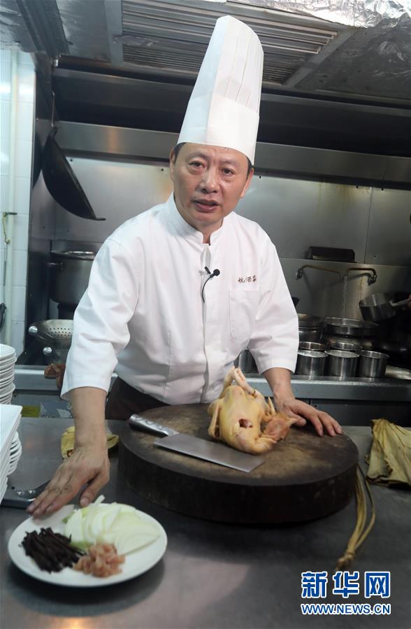 杭州酒家老板吴瑞康向记者介绍“叫化鸡”的制作工序(6月16日摄)。 金庸在武侠小说《神雕侠侣》中借郭靖之口说过: “为国为民,侠之大者。”武侠精神在香港备受推崇,有其心向中华文化的情感基础。在这个国际美食之都,品味舌尖上的武侠味,内中的感觉别有深意。 新华社记者 李鹏 摄