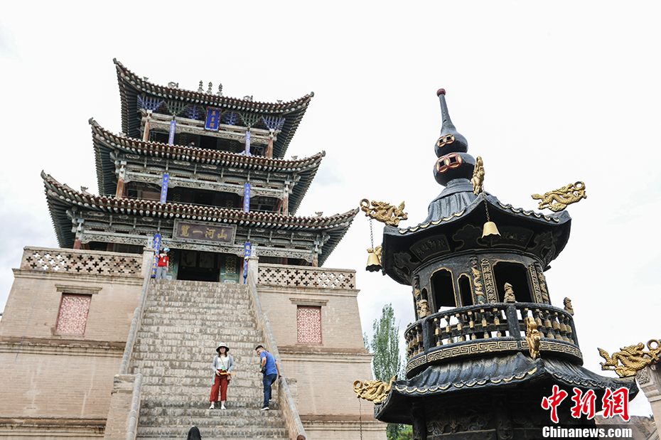 在古建筑群中最具“地标”意义的,莫过于初建于明万历年间的玉皇阁。其建筑包括山门、过厅、东西配殿和玉皇阁。玉皇阁又名万寿观,是整个建筑群之首,誉为“仙阁插云”,通高26米,有凌空出世、昂首天外之感。砖包土筑台基上起三层楼阁,分别供奉“天地人”三才,整栋建筑拔地而起、巍然高耸。 中新网记者 富宇 摄