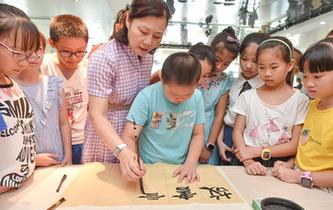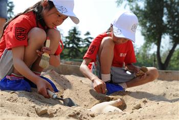 7月24日,牦牛坪小学学生在大明宫考古探索中心模拟考古现场清理文物复制品。