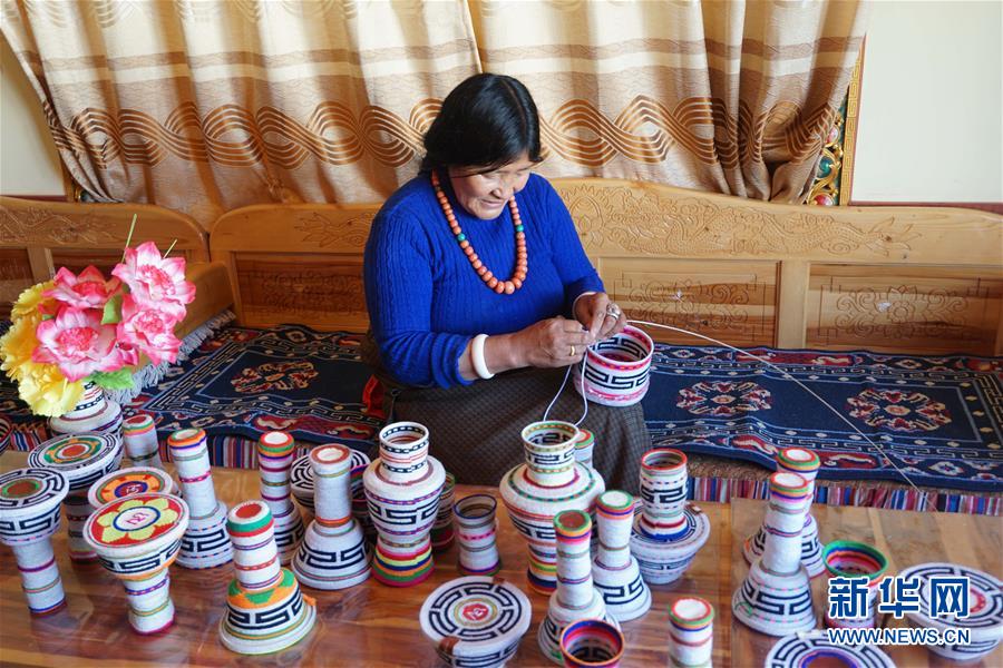 7月24日,下哈拉玛村村民措姆正在制作传统藏族手工织绣花瓶。这些织绣手工艺品一年能给措姆一家增加三四千元的收入。 四川阿坝藏族羌族自治州红原县安曲镇下哈拉玛村在脱贫攻坚战中,改变过去单一的生产方式,组织村民们学习传统藏族手工织绣手艺,增加村民收入。2017年,该村实现了整村脱贫。目前,村里正规划藏家乐等旅游产业,持续提高村民收入。 新华社记者董小红摄