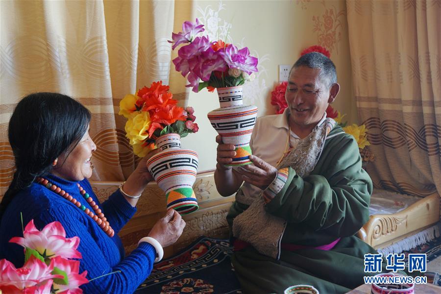 7月24日,下哈拉玛村村民措姆与丈夫在展示自己制作的传统藏族手工织绣花瓶。 四川阿坝藏族羌族自治州红原县安曲镇下哈拉玛村在脱贫攻坚战中,改变过去单一的生产方式,组织村民们学习传统藏族手工织绣手艺,增加村民收入。2017年,该村实现了整村脱贫。目前,村里正规划藏家乐等旅游产业,持续提高村民收入。 新华社记者董小红摄