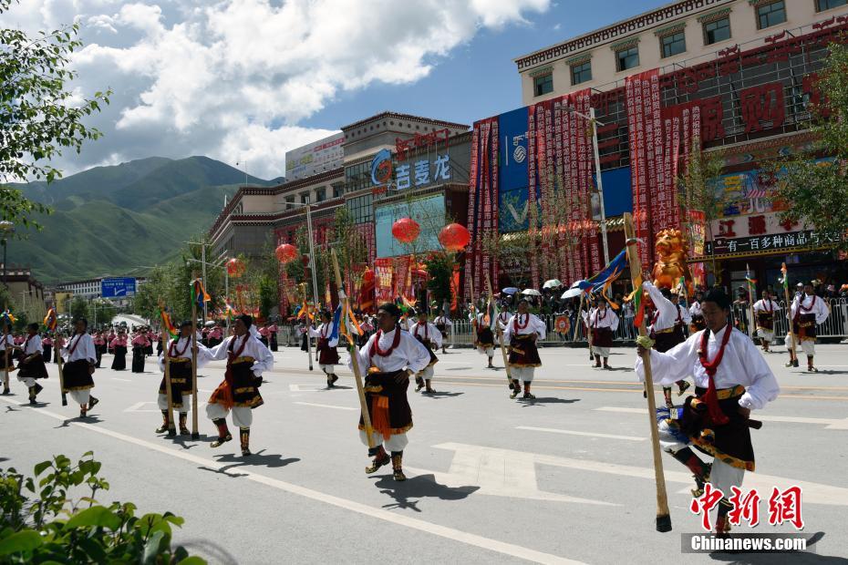 7月24日,一场名为“潇洒康巴人”的巡演在青海省玉树藏族自治州州府玉树市街头上演。当日,来自玉树州一市五县的康巴藏族儿女或驭骏马、或盛装、或歌舞,以行走巡演方式展示当地民族民俗文化。图为青海玉树囊谦县打墙舞方队。中新社记者 罗云鹏 摄