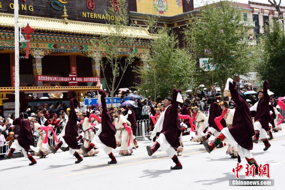 7月24日,一场名为“潇洒康巴人”的巡演在青海省玉树藏族自治州州府玉树市街头上演。当日,来自玉树州一市五县的康巴藏族儿女或驭骏马、或盛装、或歌舞,以行走巡演方式展示当地民族民俗文化。图为青海杂多格仲锅庄展示。中新社记者 罗云鹏 摄