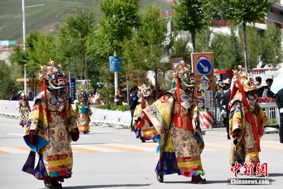 7月24日,一场名为“潇洒康巴人”的巡演在青海省玉树藏族自治州州府玉树市街头上演。当日,来自玉树州一市五县的康巴藏族儿女或驭骏马、或盛装、或歌舞,以行走巡演方式展示当地民族民俗文化。图为宗教羌姆方队。中新社记者 罗云鹏 摄