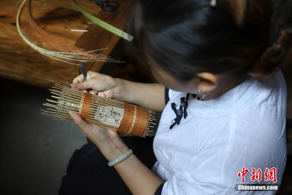 学徒正在将竹编编织在水杯上。瞿宏伦 摄