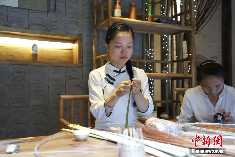 赤水竹编传承人杨昌芹在用竹子编织创新作品,杨昌芹作为90后传承人,在自己传承的同时还带动了当地20余名民众就业,年营业额达到300余万元(人民币)。瞿宏伦 摄
