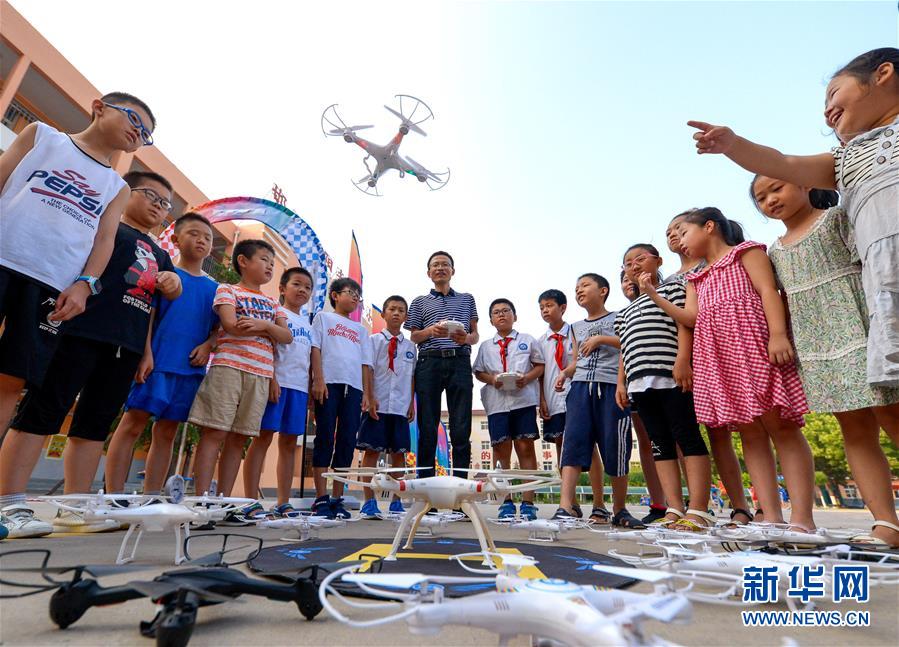 7月25日,河北省邯郸市邯山区阳光实验小学教师在指导学生操控无人机。暑假期间,河北省邯郸市邯山区阳光实验小学开设“科技知识小课堂”,学生通过组装、设计机器人,操控无人机等科普活动,锻炼动手动脑能力,丰富假期生活。新华社记者 王晓 摄