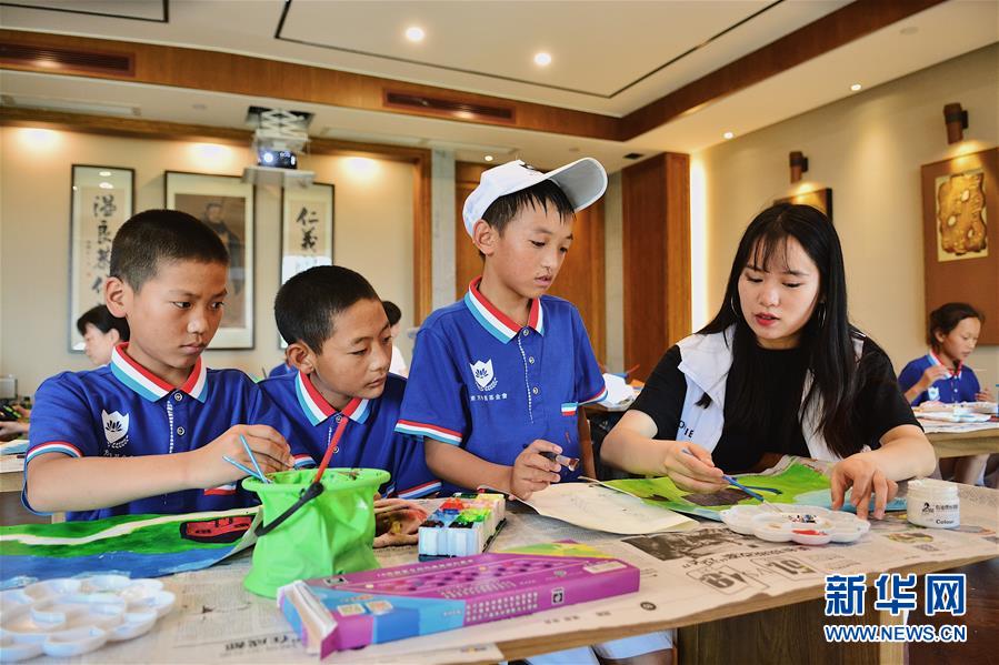 孩子们在志愿者的指导下学习油画(7月21日摄)。7月25日,40名来自四川凉山彝族自治州偏远山区的孩子结束了在成都为期10天的学习生活。据悉,从7月15日开始,66名志愿者带领这些孩子参观了成都等地的博物馆,并学习国学、太极、书法、外语、手工、绘画、音乐等课程。新华社发(李晓昱 摄)