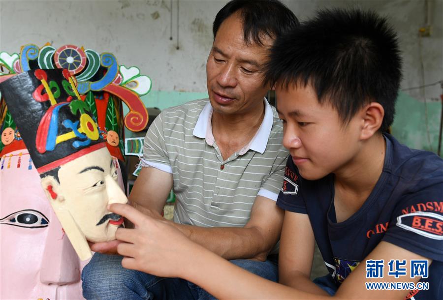 7月25日,方文展在给儿子方庭源(右)讲述毛南族傩面的雕刻技巧。广西环江毛南族自治县洛阳镇江口村大河屯农民方文展是家族第四代毛南族傩面雕刻传人,也是自治区级非物质文化遗产代表性项目——毛南族木雕技艺的代表性传承人。毛南族傩面需要用优质木料雕琢,分文、武、善、凶4大类36套72种面相,性格神态各有特点。雕刻者要在毛南族民间口头文学的基础上依据个人想象创作,一张傩面需要10多道工序花费近一周时间才能完成。新华社记者 陆波岸 摄
