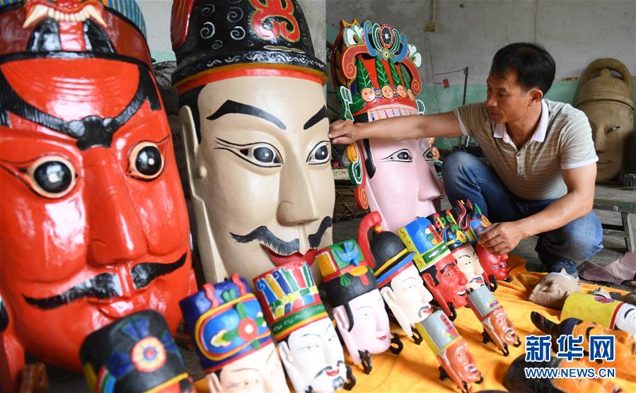 7月25日,方文展在整理自己制作的毛南族傩面作品。广西环江毛南族自治县洛阳镇江口村大河屯农民方文展是家族第四代毛南族傩面雕刻传人,也是自治区级非物质文化遗产代表性项目——毛南族木雕技艺的代表性传承人。毛南族傩面需要用优质木料雕琢,分文、武、善、凶4大类36套72种面相,性格神态各有特点。雕刻者要在毛南族民间口头文学的基础上依据个人想象创作,一张傩面需要10多道工序花费近一周时间才能完成。新华社记者 陆波岸 摄