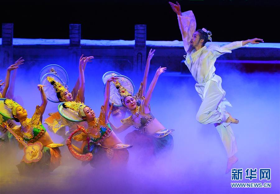 7月25日晚,演员在兰州黄河剧院演出。 当晚,《丝路花雨》兰州旅游版在兰州市黄河剧院首演,此后该剧目将在兰州驻场演出。经典民族舞剧《丝路花雨》以敦煌壁画为素材,自1979年首演至今,演出达2800余场。 新华社记者 聂建江 摄