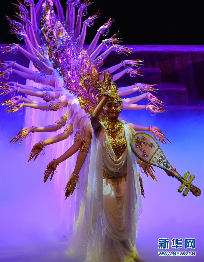 7月25日晚,演员在兰州黄河剧院演出。 当晚,《丝路花雨》兰州旅游版在兰州市黄河剧院首演,此后该剧目将在兰州驻场演出。经典民族舞剧《丝路花雨》以敦煌壁画为素材,自1979年首演至今,演出达2800余场。 新华社记者 聂建江 摄