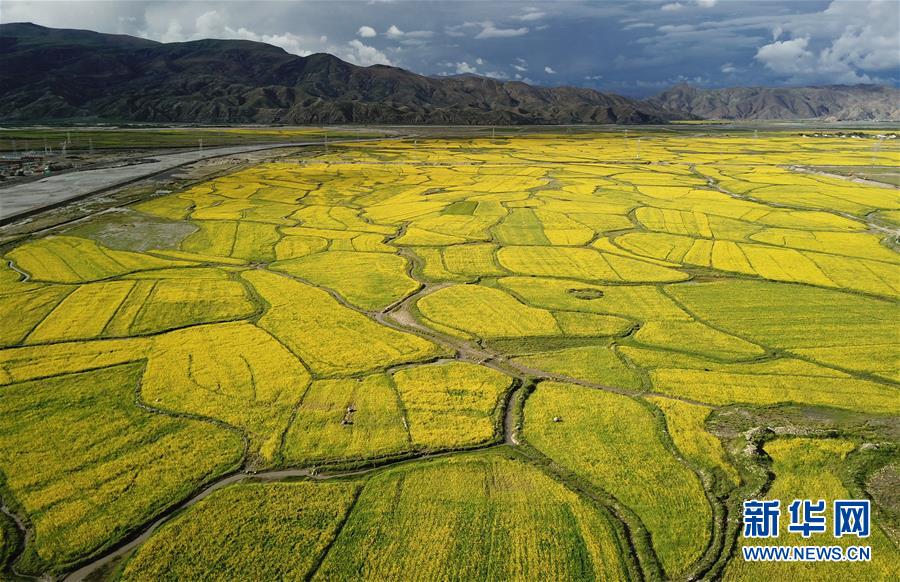 西藏日喀则市萨迦县境内盛开的油菜花(7月24日无人机拍摄)。