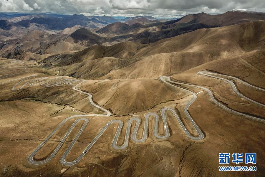修筑于西藏日喀则市定日县群山峻岭间蜿蜒曲折的公路(7月24日无人机拍摄)。