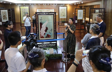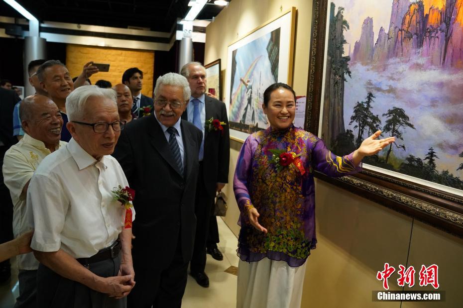 7月30日,纪念改革开放四十周年·中国美术作品主题创作展暨国际文化交流活动开幕式在北京公共外交文化交流中心举行。巴勒斯坦、摩洛哥、尼泊尔、斯里兰卡、亚美尼亚、智利等20多个国家的驻华使节出席活动并参观主题美术展。据悉,活动由公共外交文化交流中心、中国文化信息协会文化艺术人才促进工作委员会主办。展览共展出作品40幅,旨在向驻华使节及国际友人反映中国改革开放四十年来社会经济发生的变化与成绩。图为公共外交文化交流中心副会长曲真(右一)为观展的驻华使节等嘉宾讲解画作创作背景。中新社记者 崔楠 摄