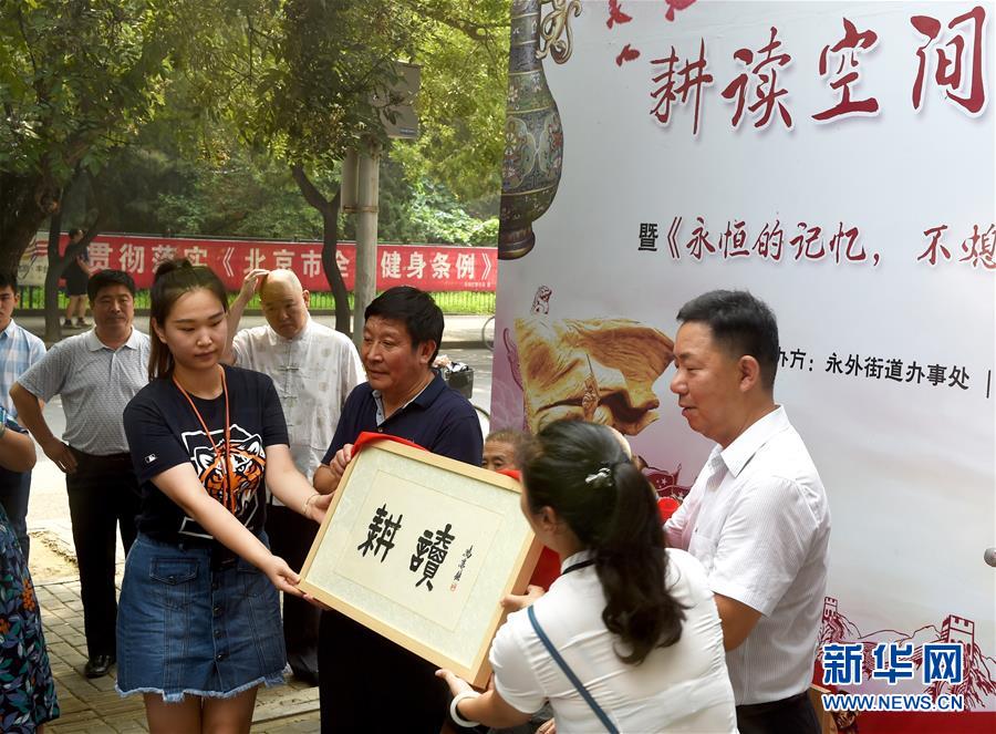 7月30日,嘉宾为耕读空间揭牌。 当日,位于北京市东城区永外景泰路上的耕读空间面向市民开放,之前这里是一排开墙打洞的小门脸,通过“疏解整治促提升”工作,为周边居民打造出一块他们自己的文化天地。 新华社记者 罗晓光 摄