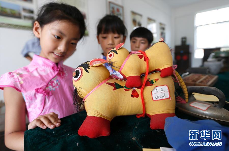 7月30日,山东青岛市即墨区段泊岚镇一学校的学生在天宫院乡村记忆馆参观手工制作的布老虎。