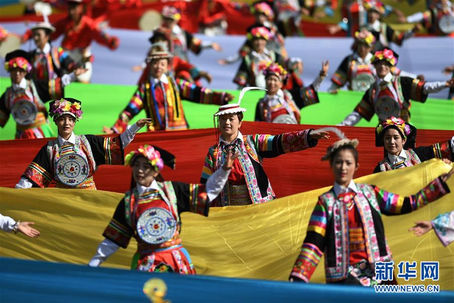 7月30日,演员在第十九届九色甘南“香巴拉”旅游艺术节开幕式上表演传统舞蹈。 新华社记者 陈斌 摄