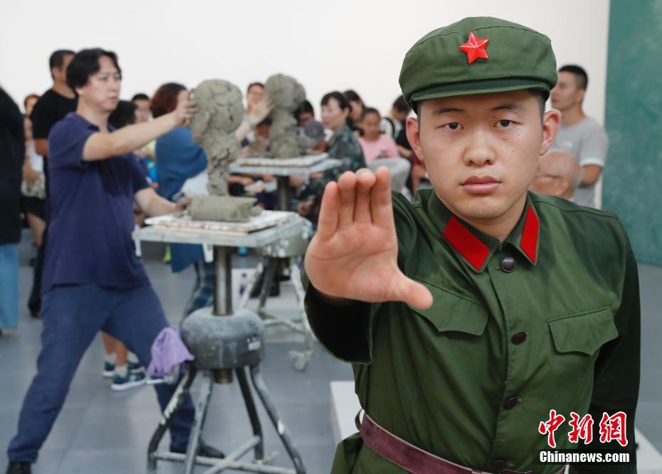 7月31日,为庆祝“八一”建军节,通过艺术创作和艺术教育的方式开展国防教育,中国美术馆在中国美术馆艺术教育空间举行“中国美术馆为军人塑像”雕塑工作坊活动。图为现场,执勤第九支队机动三中队中士薄纯成身着李登贵当年的老军装现场担任模特,配合雕塑家创作。1976年4月29日下午,在拦截反革命分子携带已点燃的爆炸药品,妄图闯入前苏联使馆,制造重大涉外事件的斗争中,李登贵同志临危不惧,英勇果敢,壮烈牺牲,年仅23岁。李登贵烈士被北京军区授予“英勇无畏的警卫战士”光荣称号。中新社记者 杜洋 摄