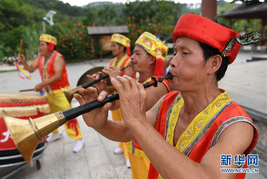 在广西南宁市青秀区南阳镇施厚村古岳坡,村民在吹唢呐为南阳大鼓展演伴奏(7月19日摄)。 新华社记者 陆波岸 摄