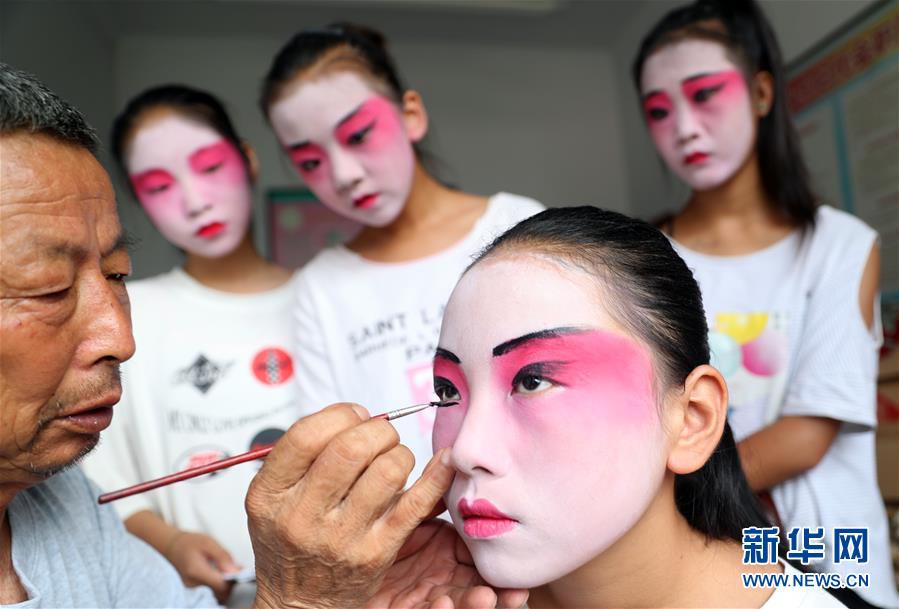 8月1日,河北省石家庄市井陉县北良都村晋剧团的师傅在指导学生们学习化妆。 新华社发(张秀科 摄)