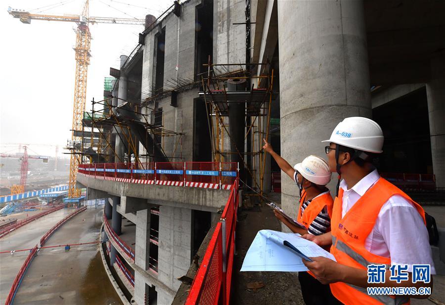 8月1日,工程技术人员在郑州博物馆新馆项目工地上讨论施工进度情况。