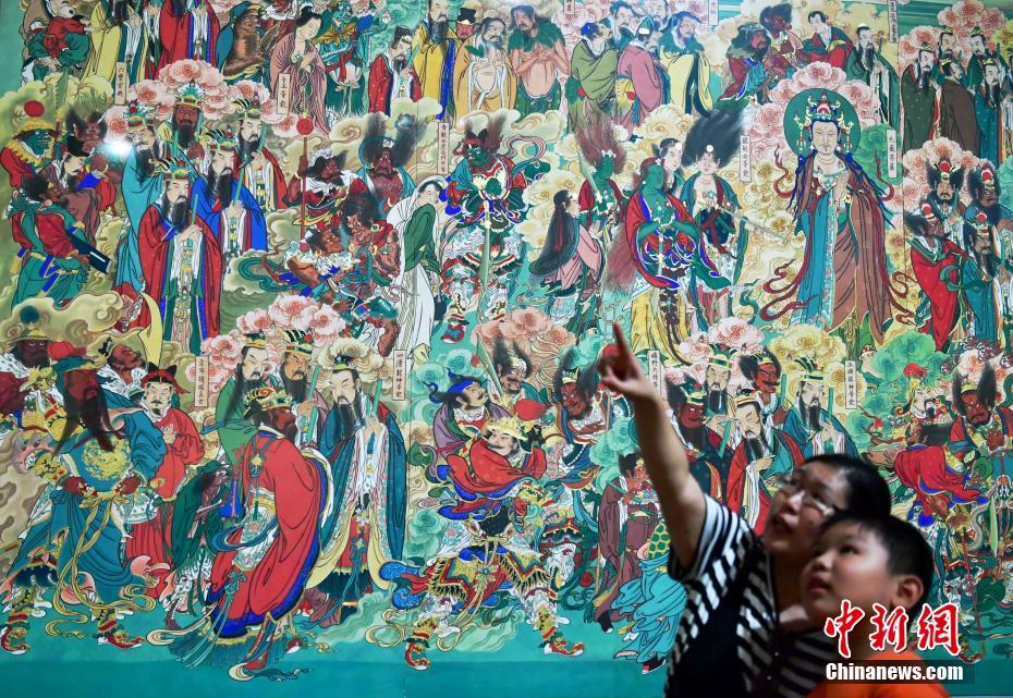 8月2日,由河北博物院、石家庄市毗卢寺博物院主办的“粉壁丹青——毗卢寺壁画艺术展”在河北博物院举行。展区的毗卢殿四壁120余平方米的中国传统水陆道场画吸引了众多参观者,工整的构图、精湛的技艺以及丰富的内涵,展现了明代壁画的精美。据记载,毗卢寺于宋、金、元、明、清时期均经修葺完善,寺内壁画也承载了历代壁画的特点以及画师高超的技艺。图为两名小孩被精美的壁画艺术展吸引。中新社记者 翟羽佳 摄