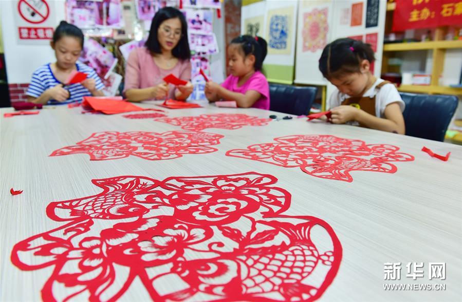 8月1日,在石家庄市桥西区谷隆剪纸传习馆里,孩子们跟着老师吕亚琼学习剪纸技法。 新华社发(章朔 摄)