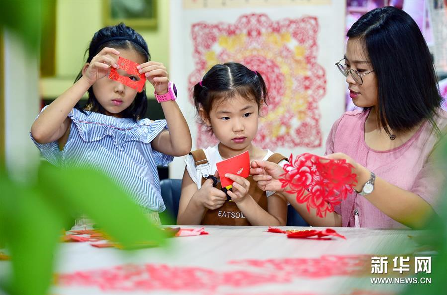 8月1日,在石家庄市桥西区谷隆剪纸传习馆里,孩子们跟着老师吕亚琼学习剪纸技法。新华社发(章朔 摄)