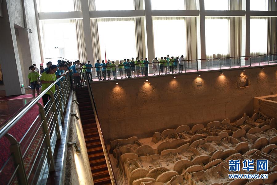 在位于曲沃县曲村镇的晋国博物馆,来自山西省临汾市的学生在参观车马坑遗址(7月31日摄)。 新华社记者 杨晨光 摄