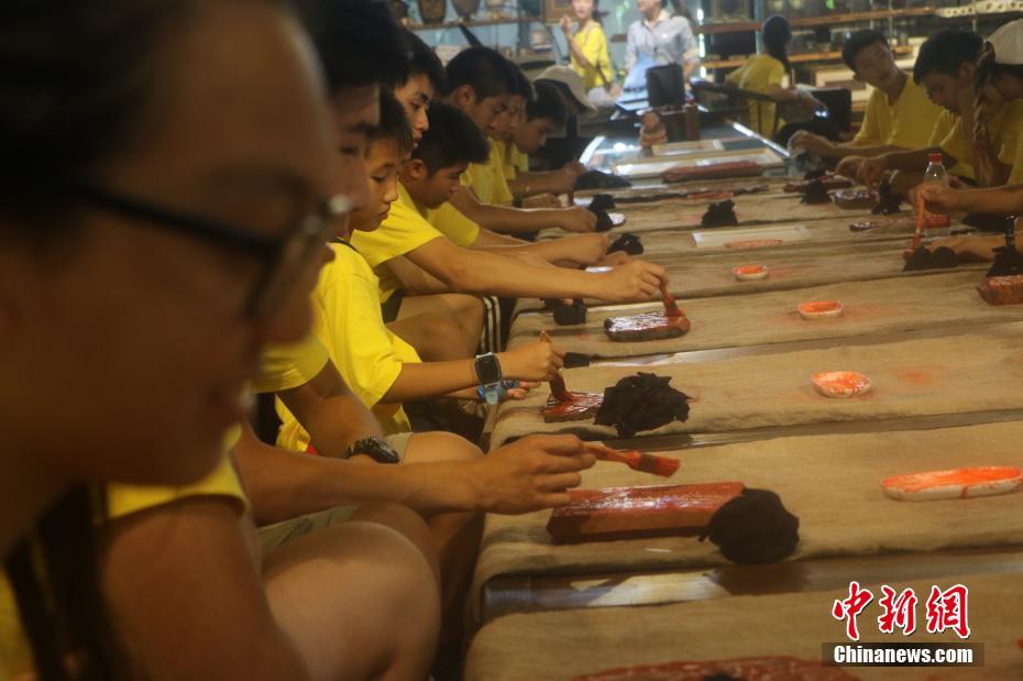 8月4日,50余名海外华裔青少年学生参观了安徽省源泉徽文化民俗博物馆,并动手实践徽派技艺。当日,2018年海外华裔青少年“中国寻根之旅”夏令营安徽营在合肥举行闭营仪式。图为学生们体验拓片艺术。 中新社记者 赵强 摄