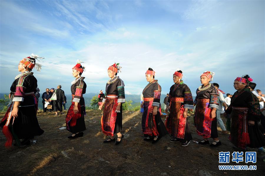 8月4日,在剑河县岑松镇巫门村,苗族同胞在“祈雨节”上踩鼓。新华社发(杨文斌 摄)
