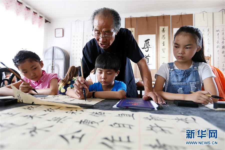 山东青岛市即墨区段泊岚镇天宫院村83岁的葛述兰老人从2009年开始在家中办起公益书法课堂,利用周末和寒暑假的时间义务为社区及周边村庄爱好书法的孩子们进行辅导,鼓励孩子们继承和弘扬中国传统文化的同时,也令他们的假日生活更添乐趣。 新华社发(梁孝鹏 摄)