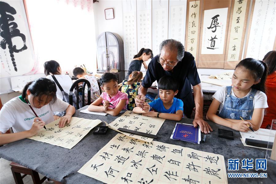 山东青岛市即墨区段泊岚镇天宫院村83岁的葛述兰老人从2009年开始在家中办起公益书法课堂,利用周末和寒暑假的时间义务为社区及周边村庄爱好书法的孩子们进行辅导,鼓励孩子们继承和弘扬中国传统文化的同时,也令他们的假日生活更添乐趣。 新华社发(梁孝鹏 摄)