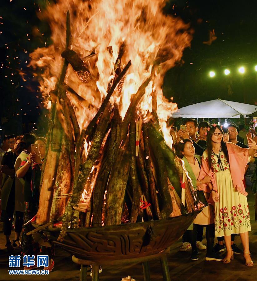 8月5日,一名女孩在云南楚雄彝人古镇火把节上自拍。 当日,在云南省楚雄彝族自治州彝人古镇,人们身着盛装,载歌载舞,欢庆彝族传统节日火把节。 新华社记者 杨宗友 摄