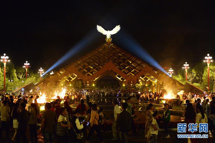 8月5日,在云南楚雄市太阳历文化园,来自全国各地的游客与彝族同胞一起欢歌起舞,欢度火把节。8月5日,全国多地的彝族同胞举行多彩的民族特色活动,欢庆火把节。新华社发(谢子艺 摄)
