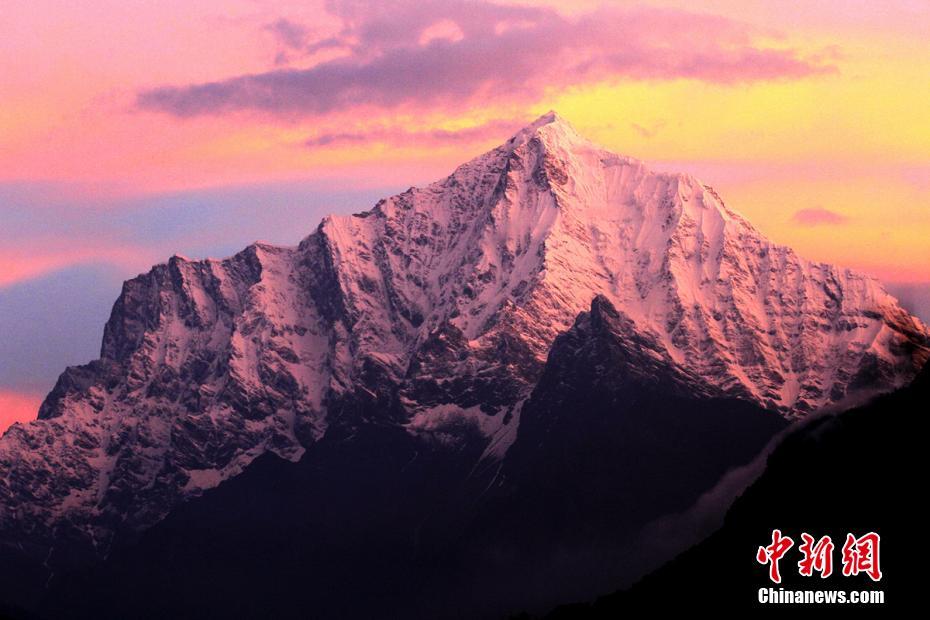 吉隆沟给人最大的感受是惊讶于造物的神奇,让四季并存在这狭小的山谷间。峡谷绿树成荫,恬静的村庄被绿树环抱着,不远处能清楚地看见若隐若现的雪山。图为红霞映雪山。 杨建 摄