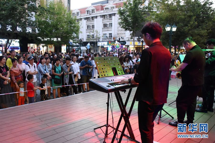 在哈尔滨中央大街上,市民驻足欣赏一场街头音乐会(8月5日摄)。