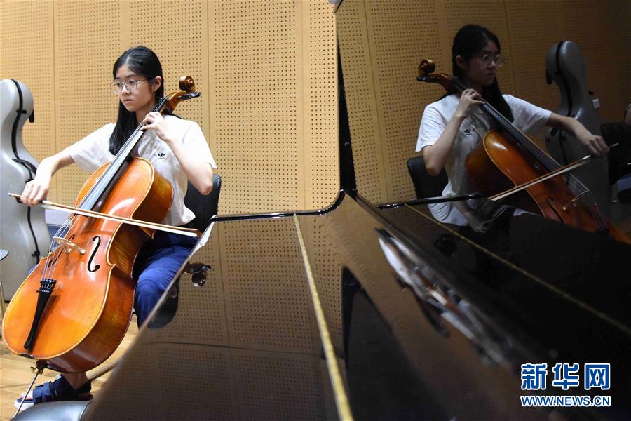 哈尔滨姑娘王梓萌在练习大提琴,她多次参加哈尔滨之夏音乐会期间的演出,还报名参加了2018勋菲尔德国际弦乐比赛(7月1日摄)。新华社记者 曹霁阳 摄