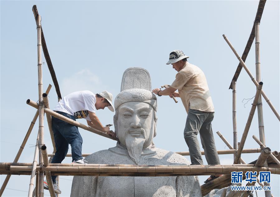 8月6日,许明笙(左)和父亲许良国在制作历史人物塑像。新华社记者翁忻旸摄